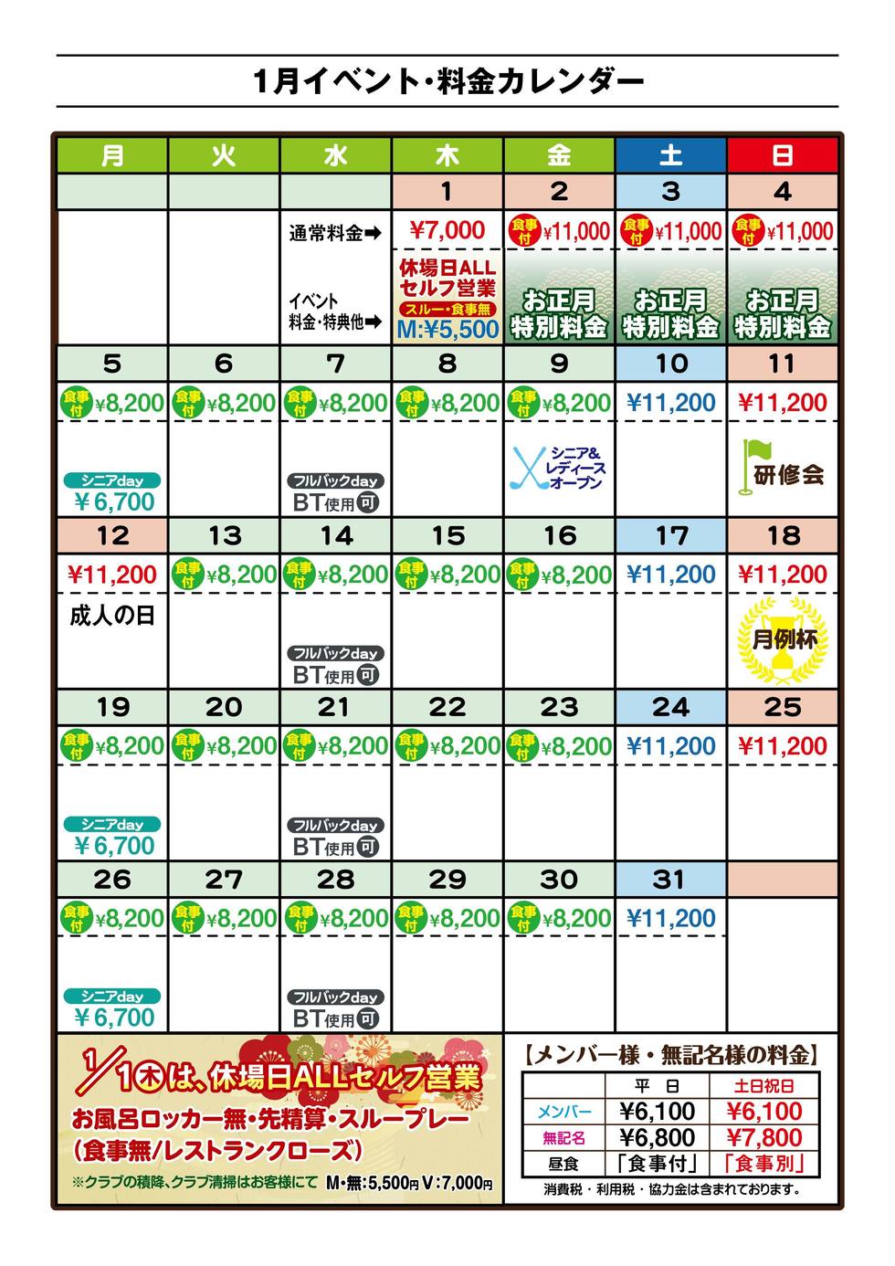 平日は食事付のリーズナブルなプレー料金で毎日営業しております。土日祝も早期予約や年間コンペ予約の特典で、食事付のお得な料金プランを実施。地域№1のベストプライスをご提供します。